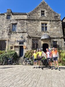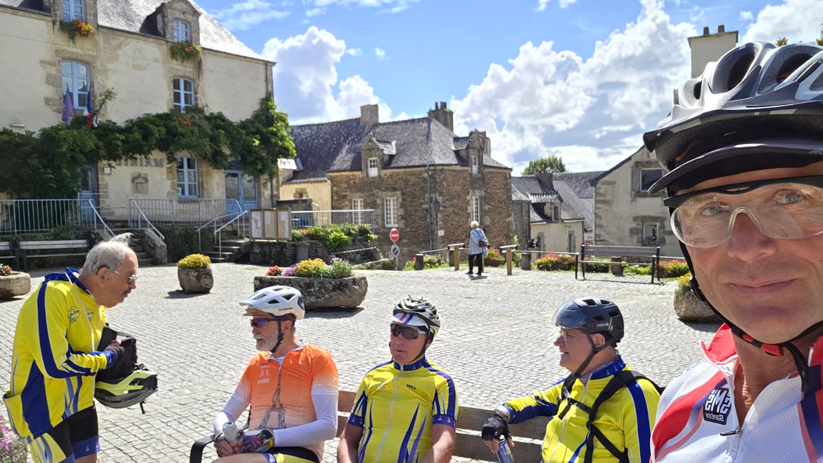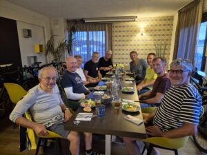 Le retour se présentait « à risque ». On annonçait de la pluie toute la journée… un élément positif, le sens du vent n’ayant pas changé, donc il nous était favorable. Comme la veille, départ des 2 groupes, ensemble cette fois, mais chacun son allure. Daniel, gonflé à bloc, tout allait bien. Nous reprenions la trace empruntée la veille, à quelques variantes près. Le parcours, aller comme retour, a été très apprécié, petites routes, majoritairement avec pas ou peu de voitures, un peu de dénivelé mais acceptable. Après une pause au café restaurant de Rochefort en Terre, curieusement baptisé « Freine le Temps », nous nous sommes retrouvés à La Gacilly, comme la veille, à l’heure du déjeuner. Cette fois, forts de l’expérience de l’aller, il nous fallait trouver un point de charge, donc, une brasserie fera l’affaire. Certains n’ayant pas attendu, avaient déjà acheté leur sandwich, le reste dégusta la tartine et le dessert du jour. On avait du temps, il fallait accorder 1 heure à la recharge… Le reste du parcours se déroula sans embuche. Nous avons déposé Yannick à Bruz, et ensemble, nous avons regagné le local, où nous attendait le groupe des rapides. Pas de soucis de batterie… Nous avons partagé un pot en compagnie des rares copains qui avaient bravé la pluie pour faire du vélo. Il est vrai que ceux qui arrivaient étaient trempés, alors que nous, humides seulement… c’est parfois curieux.