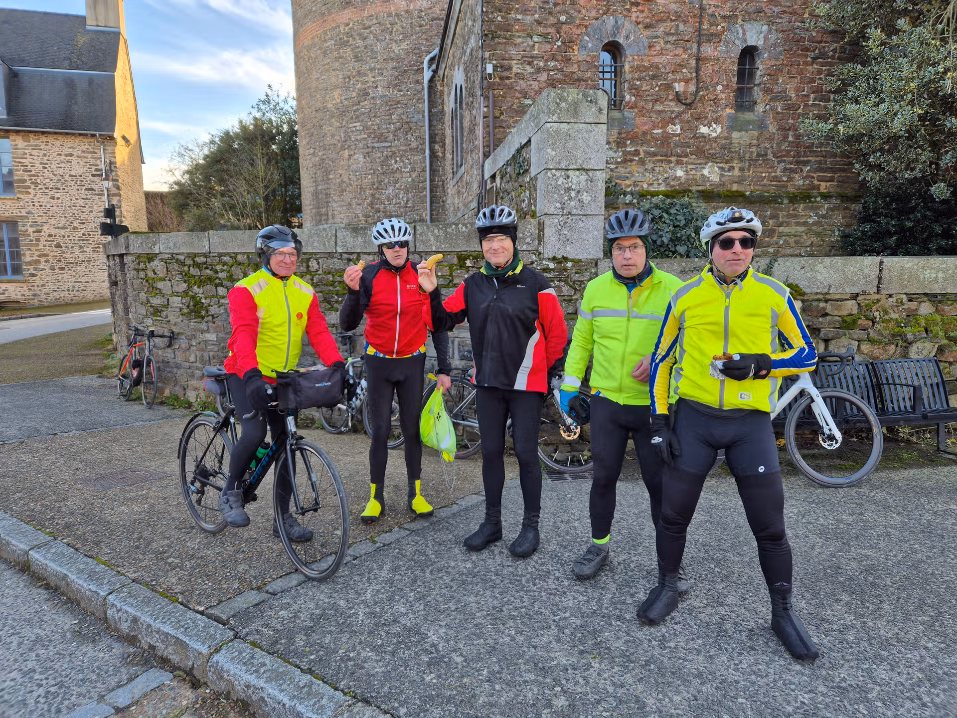 Après une pause « banane » pour recharger les organismes, nous validons le contrôle prévu à Argentré du Plessis. Plusieurs commerces permettront de recueillir le tampon. Vers Drouges, les groupes se rejoignent et achèvent le parcours matinal selon leur rythme. Vers 12h00, tout le monde se retrouve à Martigné Ferchaud, au restaurant Le Pourquoi Pas pour une formule plat/dessert très bien. Un accueil plus chaleureux aurait été bienvenu… mais, c’était bon et le service rapide, donc, l’essentiel était bien là et à 13h30, tout le monde pouvait repartir pour les 65 km nous séparant de notre local cantepien.