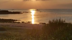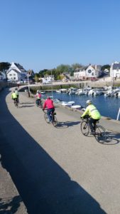 Excellent accueil de la boulangère qui avait accepté de nous préparer des formules repas malgré leur jour de fermeture. Les 2 groupes ont repris leur chemin, chacun à leur rythme, et se sont retrouvés, vers 18 heures, au Camping de l’Océan de Kerhosin à Saint Pierre de Quiberon. Nous étions attendus pour diner avant 19h00, tout va bien ! Nous retrouvons notre voiture « logistique » avec Maggie et Arlette … et nos bagages. Merci à elles, sans elles, nous aurions dû nous lester de sacoches… Après diner, et pour nous dégourdir les jambes, nous avons rejoint, à pied, le petit port de Portivy, pour y partager un rafraîchissement, face au coucher de soleil sur la mer. Superbe !